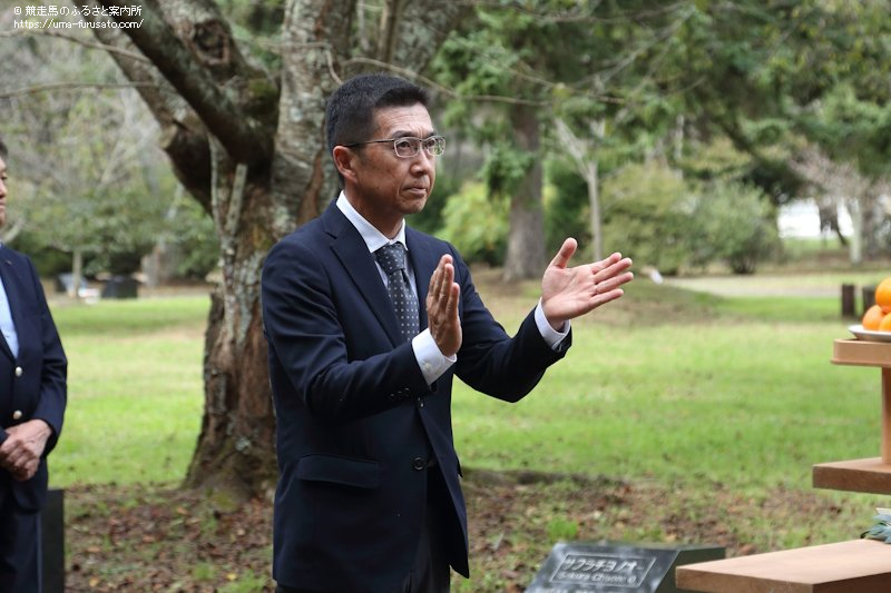 畠山会長は「本日は、お忙しいなか、多くの来賓の方々にもご参列いただき、まことにありがとうございます。昨年に続き物価高騰・景気下落による生産地への影響を懸念しておりましたが、競馬につきましては中央・地方とも勝馬投票券販売の好調を持続、また北海道市場につきましても、セプテンバーセールまで終了し総額174億円を超す好成績となり安堵しております。これから行われるオータムセールも大いに期待するところであります。さて、さきほど、事務局からも説明がございましたが、昨年の慰霊祭終了後にイシノサンデー号の墓碑建立、ネームヴァリュー号の繫殖雌馬之碑の刻銘がございました。平成2年より開設されまして、現在は墓碑、集合体を併せ140頭の名馬の刻銘を行っており、今後もこの事業は継続して参ります。みなさま方にはご指導ご鞭撻のほどよろしくお願いいたします。最後に、ここに眠る名馬のみならず、今日の競馬の隆盛を築いてこられた先人のみなさまやたくさんの馬たちに感謝の言葉を贈ります。ありがとうございました」とあいさつした。