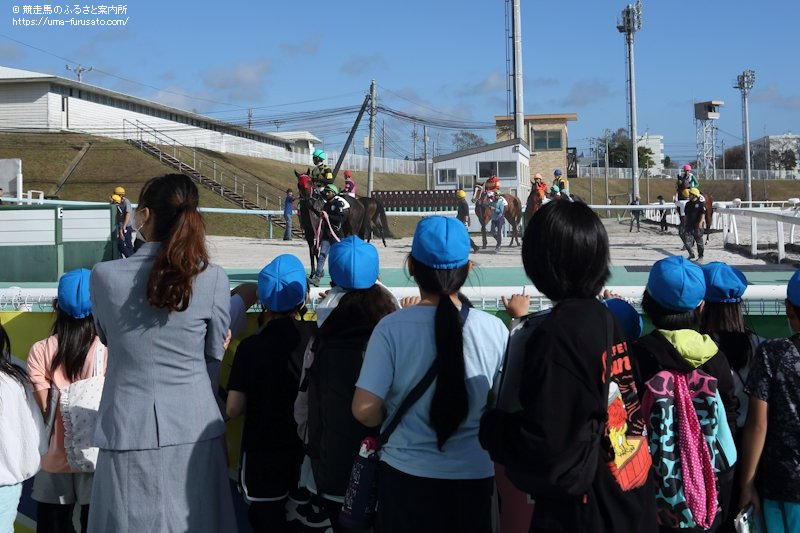 児童はレース前に馬がお披露目されるパドックやレースを見学。パドックを見て各自が気になった馬をゴール板前で応援した。