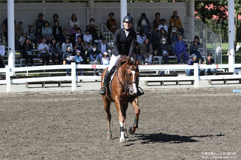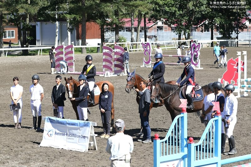 優勝したエイカイロイヤルはディープインパクト産駒で、セレクトセール1歳で1億584万円(税込)で取引された馬。競走馬としては3戦0勝という成績で、引退後はモモセライディングファームで乗馬となり、真駒内乗馬クラブでリトレーニングを積んで大会出場となった。コンビを組んだ中垣彩也加さんは「リトレーニングではフラットワークをしっかりできるように取り組んできました。競技は1番目の出番でもあり、できるだけ攻めていこうと考えていました。優勝と知ったときは嬉しかったです。ウイニングランもできて、祝福の言葉をたくさんいただきました。エイカイロイヤルは乗馬のセンスがあり、普段は人懐こくて、寝るのが好きな馬です。リトレーニングをさせていただいたモモセライディングファームの皆さんに感謝しています」と、振り返った。