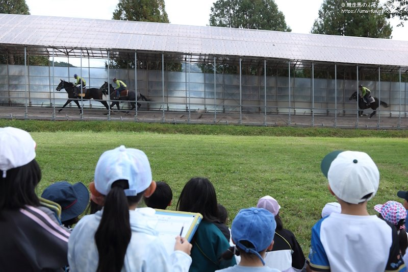 ビッグレッドファーム明和では1,100mの屋根付き坂路コースにてトレーニングする育成馬、今年生まれた子馬とお母さん馬の親子、数多くの活躍馬を送り出す人気種牡馬のゴールドシップを見学。児童は競馬へ向けての練習、子どもの育て方、種牡馬の仕事について学んだ。