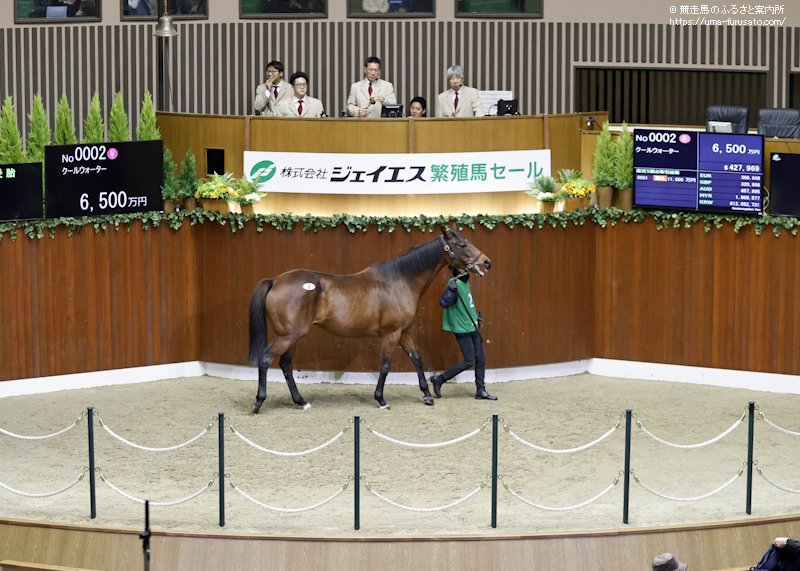高額第2位はヨーホーレイク、カミノタサハラ、ボレアスなどの全妹でルーラーシップ産駒を受胎しての上場同2番「クールウォーター(9歳、父ディープインパクト)」。500万円(税抜)からスタートしたせりは会場の複数内から声がかかり、ゆっくりとだが確実に入札が重ねられ、異例とも言える長時間のせり。最終的には71,500,000円(税込)で(株)チャンピオンズファームが5分以上にも及んだ競り合いを制した。