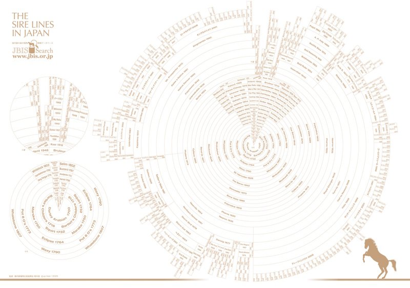 特長は、円形状の中心に「ゴドルフィンアラビアン・バイアリーターク・ダーレーアラビアン」のサラブレッド三大始祖を配置し、それらの父系から代を重ねた現役種牡馬を外周に配列しました。外周に配列された現役種牡馬の血統の流れをひと目でさかのぼることができる仕上がりとなっております。