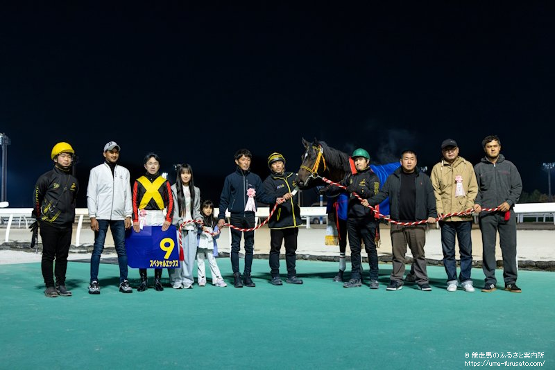 ホッカイドウ競馬のスピード王決定戦JBC協会協賛「東京スポーツ杯第20回道営スプリント(ビッグアーサー賞)」が11月5日、門別競馬場で行われ、道中は2番手を進んだ吉原寛人騎手騎乗の2番人気スペシャルエックスが1分12秒7(やや重)で優勝。今年1月の兵庫ウインターCに続く重賞制覇で、道営スプリント2連覇を成し遂げ、通算成績を22戦10勝2着4回3着1回(重賞6勝)とした。