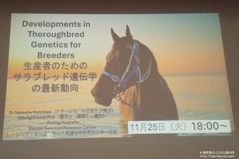 11月25日夜、新冠町中央町にある新冠町レ・コード館町民ホールにおいて、豪州の馬遺伝学の第一人者によるサラブレッドの遺伝学に関する講習会が開催された。