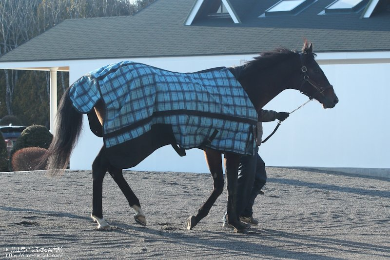 12月22日、新ひだか町静内目名にあるレックススタッドに、2026年から種牡馬として新たに供用を開始するバトルハーデンが、元気な姿でスタッドインした。