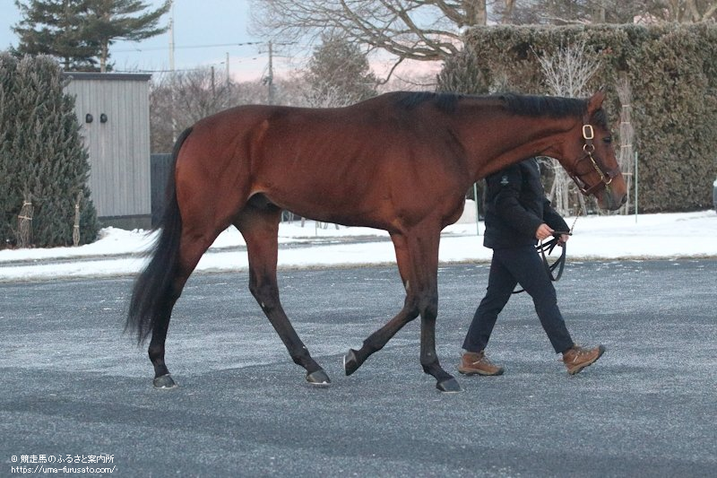 12月23日早朝、安平町早来源武にある社台スタリオンステーションに、2026年から新たに種牡馬として供用を開始するベラジオオペラが、元気な姿でスタッドインした。
