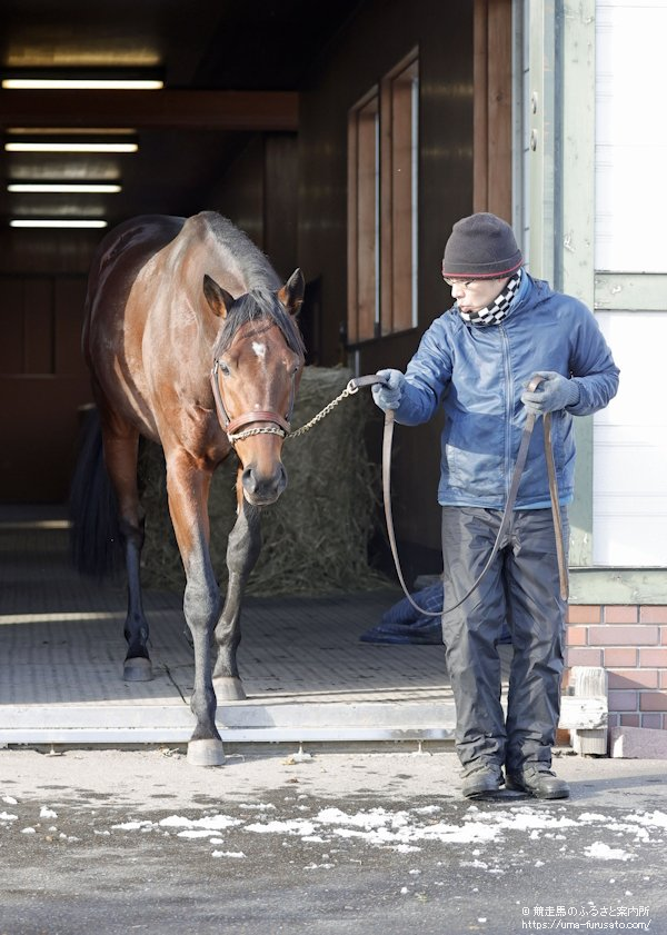 「到着したのは23日の夜です。旅慣れた馬ですから、移動中はスムーズだったようです。到着が夜だったせいもあるのでしょうが、バタバタすることなく落ち着いていましたよ」と同種馬場の野田場長が、当日の様子を教えてくれた。