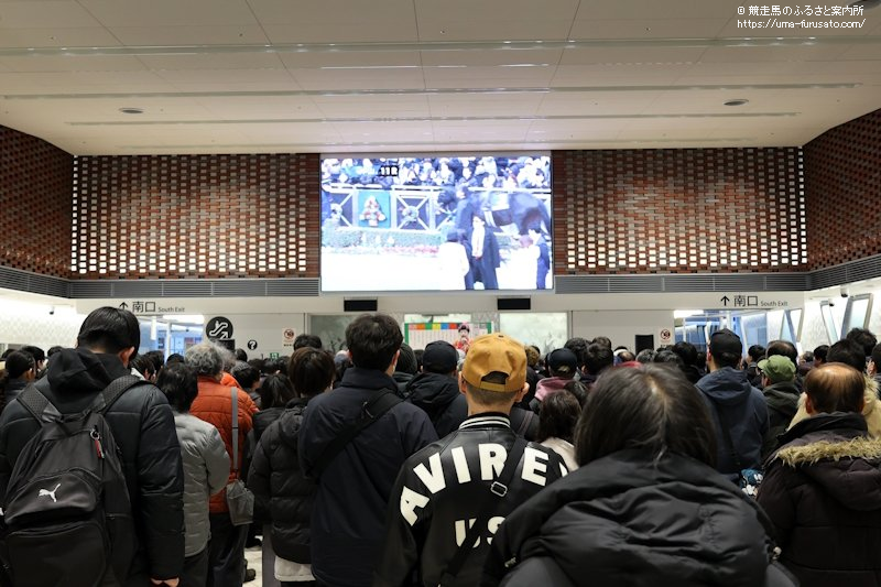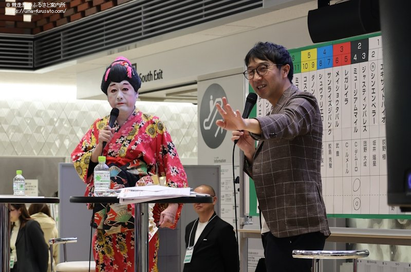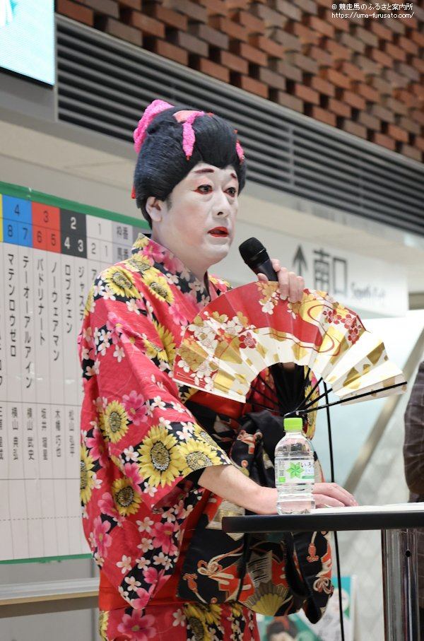 この日はHBC(北海道放送)のアナウンサーで、YouTubeチャンネルの「HBC競馬部」で部員となっている水野善公アナウンサーが呼び込みする形で、ステージ上に姿を見せたコウメ太夫さんはネタを披露。「チクショー!」と叫ぶたびに、コンコース内では笑いだけでなく拍手も起こっていた。