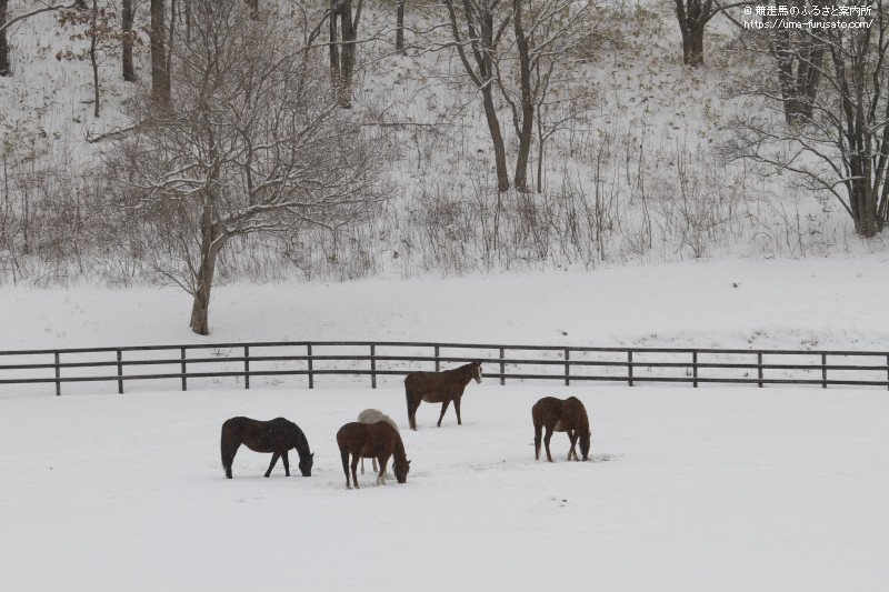 写真3 [放牧地] 雪の下の草を食む馬たち。