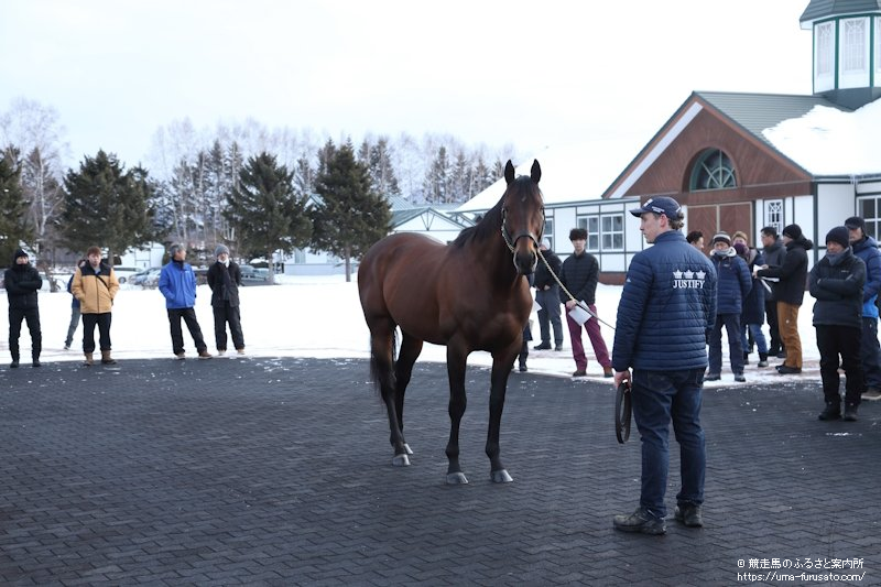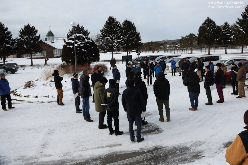 浦河町軽種馬生産振興会は、浦河町浦河地区の牧場後継者らで組織。種牡馬視察研修は毎年1月に実施している青年部の恒例イベントで、本年は田中駿部長をはじめとした青年部員のほか、荻伏軽種馬生産振興会青年部の部員、浦河町西舎にあるJRA日高育成牧場の職員、公益財団法人軽種馬育成調教センターの職員、浦河町と荻伏の青年部OB、浦河町の生産牧場や育成牧場の関係者など50人以上が参加した。