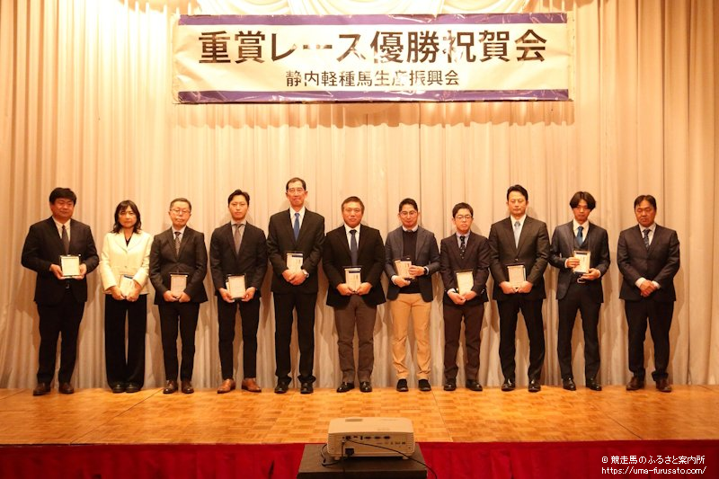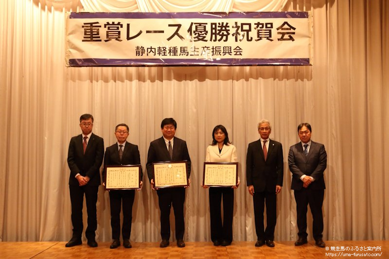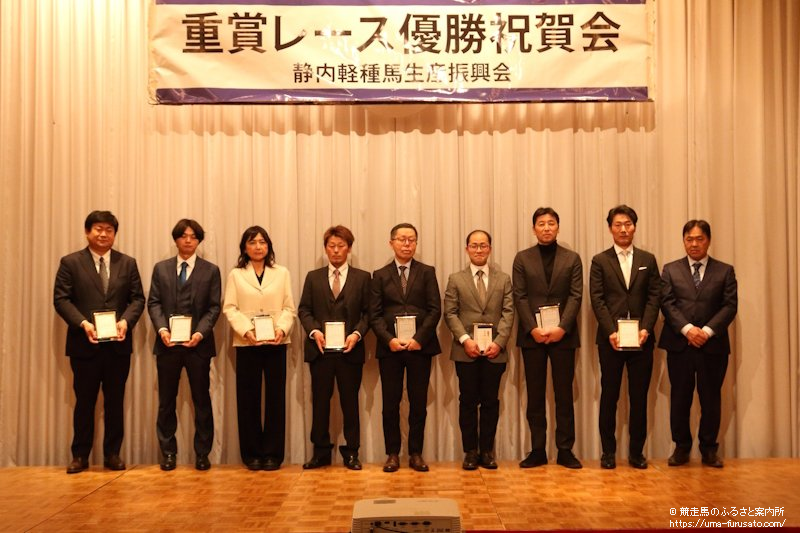 2月13日夜、新ひだか町静内吉野町のある静内エクリプスホテル2階エクリプスホールにおいて、静内軽種馬生産振興会(畠山史人会長)の主催で令和7年度重賞競走優勝牧場を祝う会が開催された。