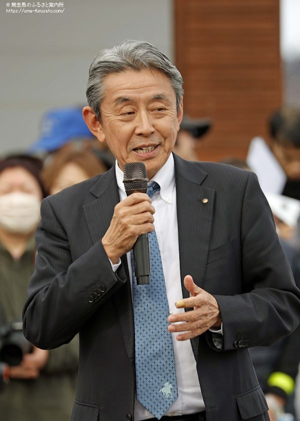種牡馬展示会の開催にあたり、同協会の上野儀治副会長・常務理事は「昨年11月、長く青森県軽種馬生産農業協同組合の代表を務めてこられた山内組合長が亡くなられました。この場を借りて、謹んで哀悼の意を表したいと思います。寂しい限りではありますが、佐々木新組合長を支えながら、東北地区の生産を応援してまいります。今日は、遠方から足を運んでいただいた方を含め、これほどたくさんの方にお集まりいただきました事、感謝申し上げます」とあいさつ。
