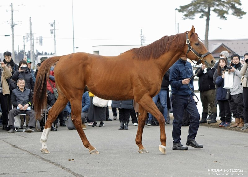 そしてウインバリアシオンは、佐々木代表が「雄大な馬格と素直な気性。ご存知のとおりハヤテノフクノスケがレコード決着となった函館記念(G3)で2着。その後、休養を余儀なくされていましたが、復帰にむけて乗り込みを開始しました」と、本馬の魅力とともに代表産駒の近況も伝えられた。