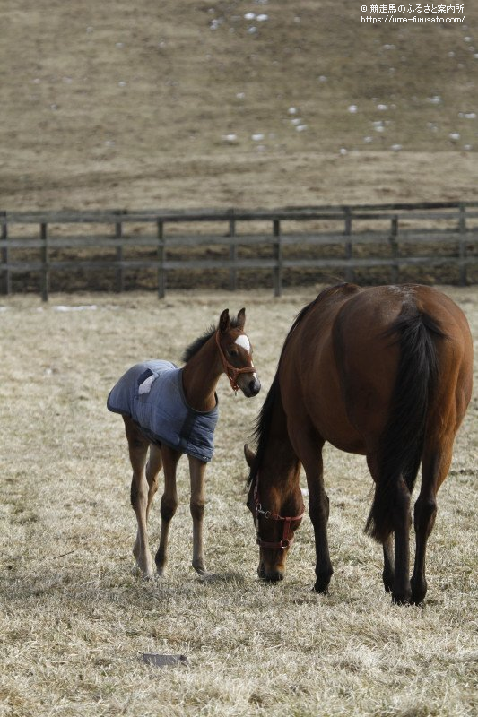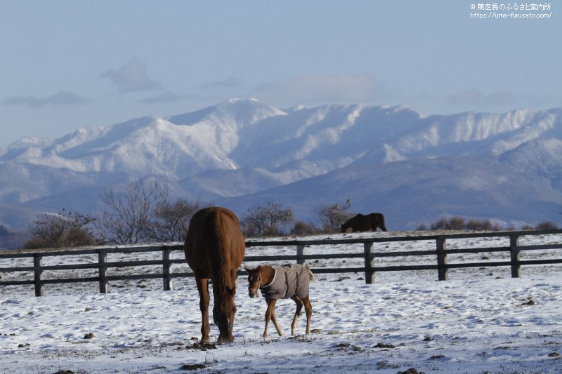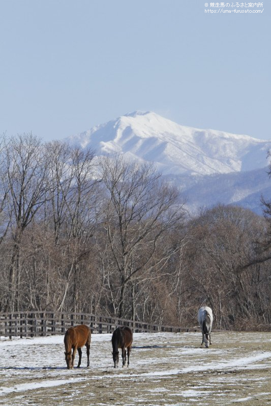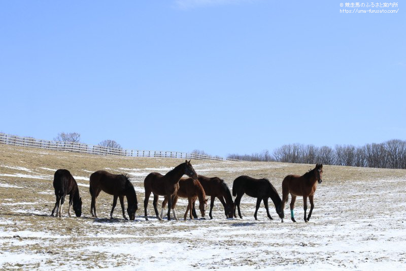積雪の残る放牧地には、仔馬などが見られる風景に。