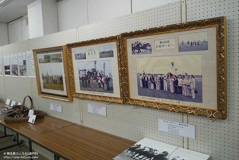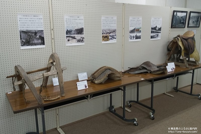 会場では馬そりや馬鍬(まんが、まぐわ)、ダルマ環、犂(すき、からすき)、プラウといった馬関係の農具、背鞍(輓馬用)、荷鞍(にぐら)、馬鈴(ばれい)、馬のわらじ、馬鞭、鞍骨(わらび形)、尾廻し(尾枷)、荷車(大八車)などの馬が使った農具、牛馬売買台帳、売渡証、牛馬商免許鑑札、大坪流馬術指南書、日高種馬牧場匹一覧、馬御払下之義二付奉願書、御請書、馬箱票綴、畜牛健康証入といった資料を展示。様似の由来、様似に初めて馬が入ったもは寛政元年とされる様似の馬のはじまり、蝦夷地の開拓を支えたとされる在来馬のどさんこ、様似の馬の歴史、昭和30年ころまでは馬による移動が見られたという、移動手段としての昔の馬のおしごと、車が一般に普及する前の昭和後期に物資や木材運搬に重宝されたという、運搬としての昔の馬のおしごと、田んぼの代掻きや農地で土を耕す作業、埋まった根や石を引き抜く作業で利用された、農耕という昔の馬のおしごと、様似の住吉神社やエンルム海岸、西町海岸の砂浜での祭事として行われた輓馬競走(競馬)としての昔の馬のおしごと、馬頭観音、絵馬、様似における馬の売買を行う馬市の様子、様似町における昭和18年ころの軍用保護馬の訓練風景、昭和42年の様似町における軽種馬育成の様子、様似町生産の活躍馬、函館大径、陸潤一郎、対馬政雄といった様似町ゆかりの馬にかかわる人物、ウマオイ、ウマカマドといった馬の名がつく昆虫、オオセンチコガネ、センチコガネ、ダイコクコガネ、マグソコガネといった馬のうんちに集まる昆虫、アメンボ、ヤスデ、マテガイ、ウマヅラハギ、オシダ、ウマスギゴケ、カバ、アシカなど、馬に関連した名前を持つ生き物などを写真や実物で紹介した。