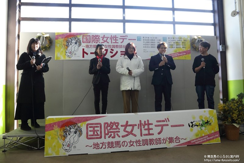 場内1階中央南側特設ステージにおいて行われたトークショーは2回に分けて8人が登壇。競馬ライターとして活躍する井上オークス氏の司会で、競馬の社会に入ったきっかけや調教師になった動機、ばんえい競馬の印象、自分が所属する競馬場の特色、調教師としての方針などを話した。