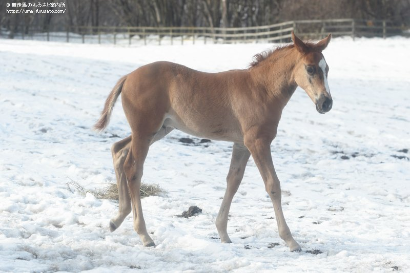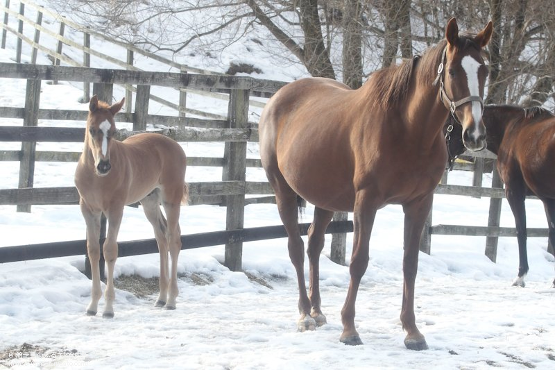 1月1日に新冠町新栄にある村上欽哉牧場で生まれたジャスティンミラノの初仔がお披露目された。