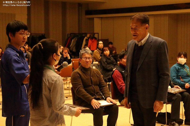 続いて、探検隊を受け入れた木村秀則牧場の木村秀則氏、ビッグレッドファームの長田基洋氏、レックススタッド代表で一般社団法人札幌馬主協会会長理事の岡田牧雄氏、アロースタッド事務局(株)ジェイエスの野呂祐之介氏、ひだか・ホース・フレンズを運営する日高軽種馬農業協同組合業務部長の小島謙治氏らに、子どもたちが記念品を贈呈。木村秀則氏は「子供たちの成長を実感しました。馬を好きでい続けてほしいですし、小さな牧場ですがいつでも遊びに来てほしいです」、小島謙治氏は「体験したことを糧にして馬について興味を深めてほしいです」などとメッセージを送った。