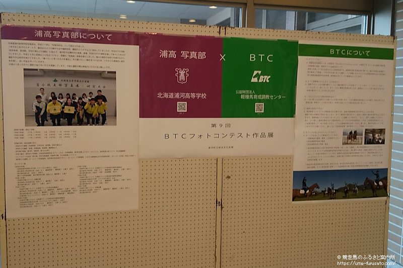 第9回BTCフォトコンテストでは21点の応募作品のなかから、BTC役職員の投票により「理事長賞」および「優秀賞」2作品、特別賞として「JRA日高育成牧場賞」と「日高振興局賞」を選定。作品展では入賞作品5点を含めた全21作品が飾られた。また、浦河高等学校写真部や公益財団法人軽種馬育成調教センターの概要や取り組みなどをパネルで紹介した。
