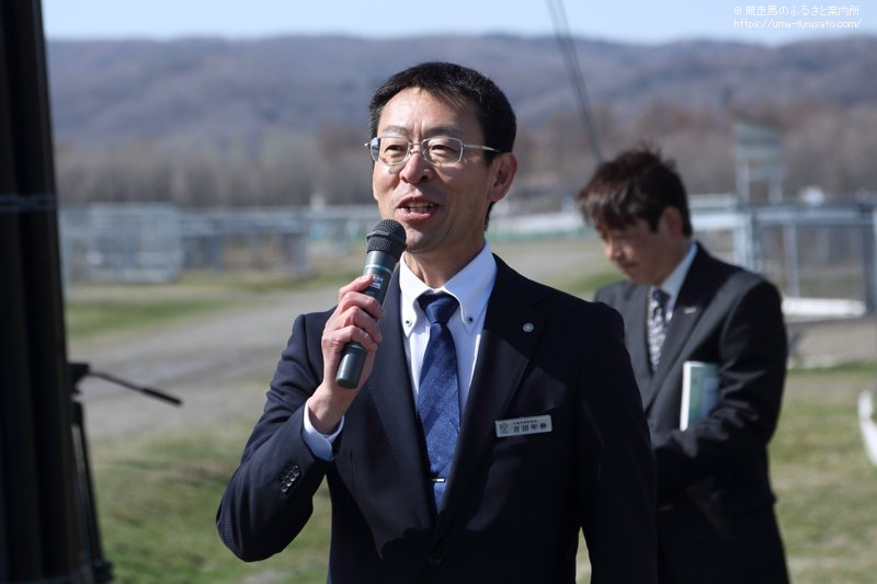 ブリーズアップセール、中山競馬場での開催まであと2週間余りということになりました。われわれの調教スタッフ、 JRA職員が、ここまで情熱を持って、熱いおもいで管理、調教してきた、大切に育ててきた馬たちとの別れの時期も近づいているわけですけれども、競馬は本当に大きなロマンと夢がございます。来年のいまごろは、クラシック戦線を賑わせているというような馬がいる可能性が、今日いまから展示する一頭一頭の馬にはございます。そういった馬たちを無事2週間後のブリーズアップセールに上場させて、きゅう舎に送り届けるまで、われわれがしっかり管理を続けていくということを、みなさんにお約束して、わたしのあいさつに代えさせていただきます。本日はどうぞよろしくお願いいたします」とあいさつした。