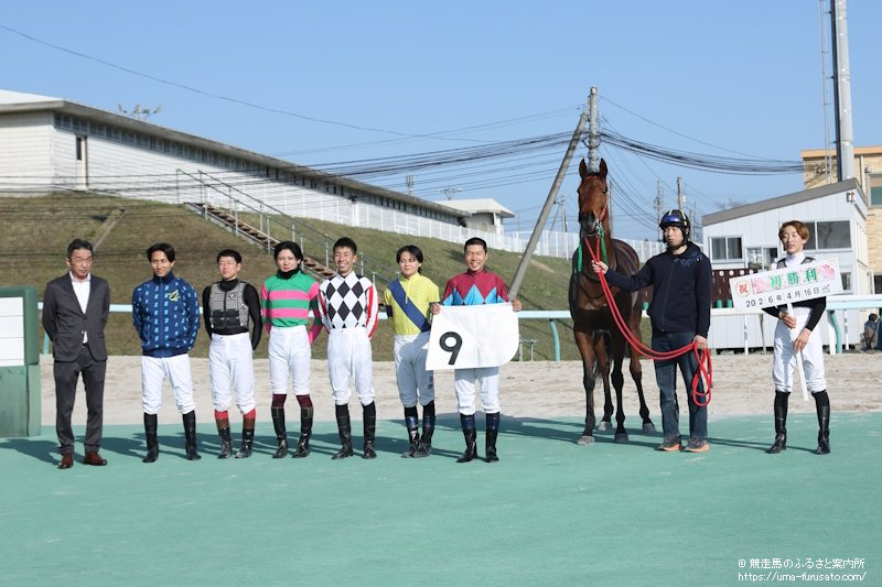 颯爽と検量室に戻ってきた小川悠汰騎手には、集まった競馬ファンや厩舎関係者が「おめでとう」と祝福。記念写真には兄弟子の小野楓馬騎手と藤田凌駕騎手のほか、先輩の岩橋勇二騎手、落合玄太騎手、阿岸潤一朗騎手、宮内勇樹騎手も駆け付けた。